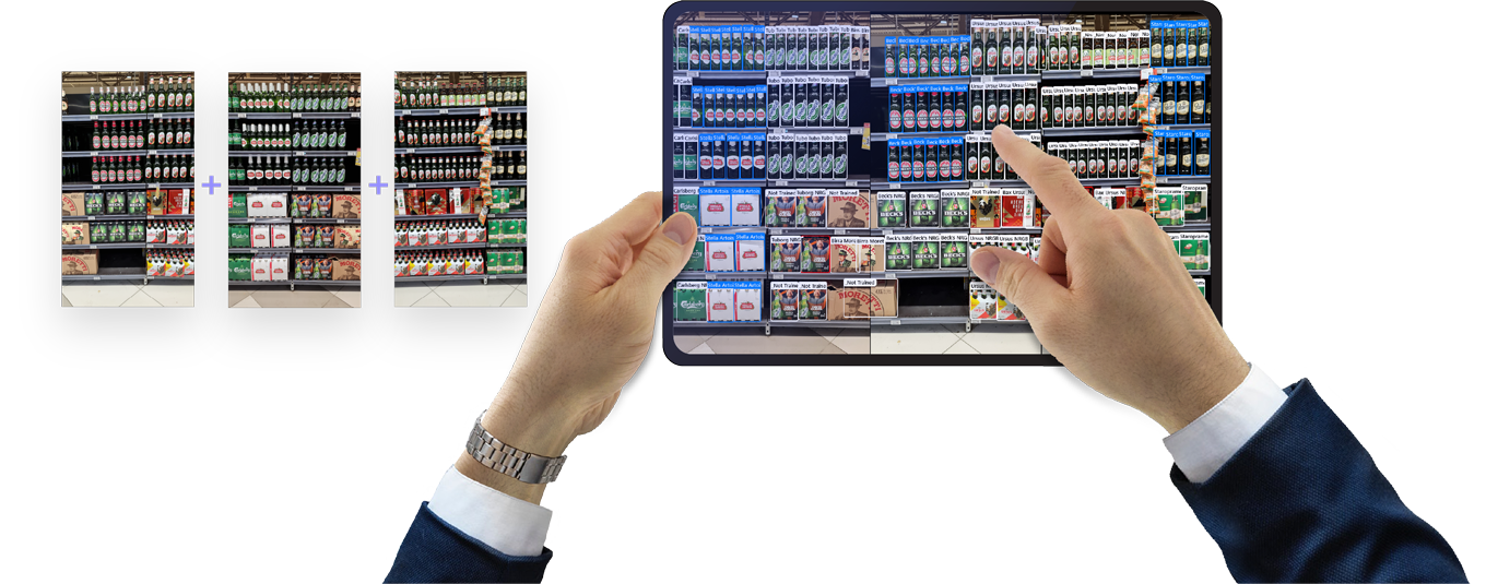 În plus, funcția de Stitching (exemplificată mai jos) ajută utilizatorii să captureze corect imaginile rafturilor lungi, asigurându-se că niciun produs nu este omis sau numărat de două ori atunci când se combină fotografiile parțiale ale raftului pentru a crea o imagine completă a unui raft mare.