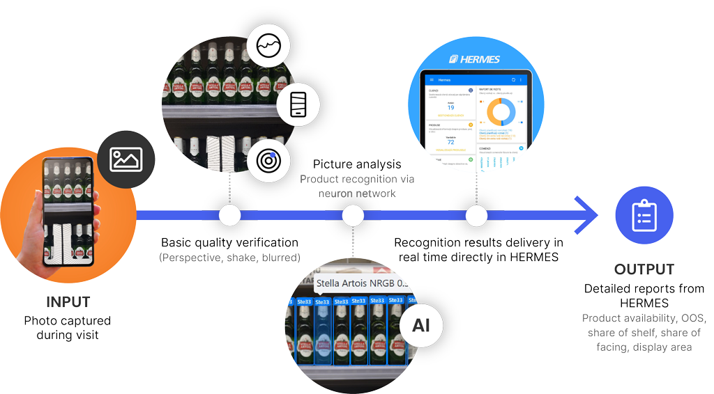Cu HERMES IRIS, oferim o soluție de merchandising care integrează tehnologii AI pentru recunoaștere de produse (Image Recognition) și calcularea automată a indicatorilor de performanță în Retail Execution.