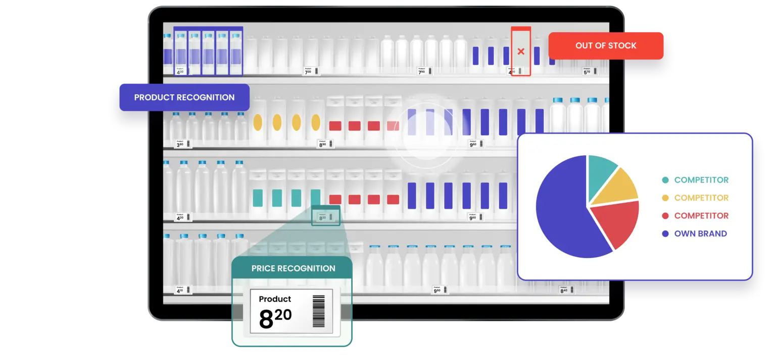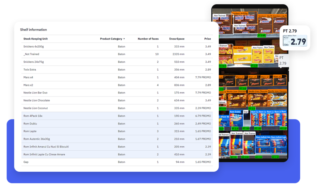 Automatizați și optimizați auditurile magazinelor cu analize avansate ale rafturilor pentru a spori vânzările. Sistemul nostru extrage date cheie precum numărul de fețe, informații despre competiție, share of shelf sau prețuri direct din fotografiile realizate la rafturile magazinelor, generând rapoarte de audit instant.