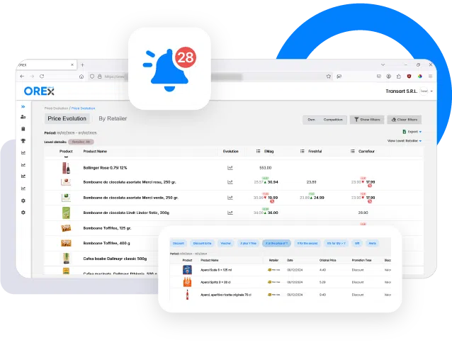 Automatizează urmărirea diferitelor tipuri de promoții la diverși retaileri pentru a obține date care te ajută să îți ajustezi promoțiile la nivel de SKU și retailer, maximizând astfel vânzările. Monitorizează și primește notificări despre istoricul promoțiilor concurenței, strategiile de preț și promovare, pentru a reacționa rapid sau pentru a obține idei de noi tipuri de promoții pentru brandurile tale. Verifică dacă retailerii implementează și respectă promoțiile tale. De asemenea, poți primi alerte despre modificările legate de produsele tale și ale concurenței.