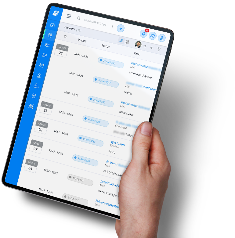 Ajungi simplu la toate informațiile de care ai nevoie, atunci când ai nevoie. Știi mereu cine s-a ocupat de task-uri. Și ai tot istoricul clienților la doar un filtru distanță. În aplicație ai totul despre clienți și despre propria activitate. Iar dacă ești Supervizor, descoperi într-o clipă orice ai nevoie despre activitatea Account Managerilor pe care îi ai în subordine. În plus, poți vedea rapoarte comparative pe diferite perioade.